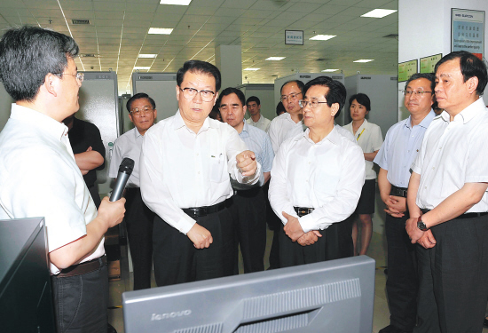 6月5日下午,中共中央政治局常委李长春在中控科技集团有限公司考察企业自主创新工作。(本报记者 黄曙林 摄)