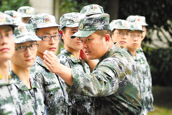 昨天,浙大5600名09级新生结束军训。同学们说,军训磨炼了意志,增强了体质,培养了集体观念。图为新生们在教官的指导下一丝不苟地训练。(通讯员 颜鹂 张理中 摄)2009-09-12