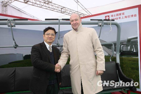 (11月16日,上海世博会首个进行长三角地区巡展的国家馆——瑞士国家馆亮相“天堂”杭州,在浙江大学摆下“擂台”,备战上海世博会。瑞士驻上海副总领事石韬表示,上海世博会观众预计将达七千万人次,其中半数以上将来自长三角地区。图为瑞士驻上海副总领事石韬和浙江大学党委副书记郑强在瑞士馆观光缆车前合影。 中新社发 汪恩民 摄)