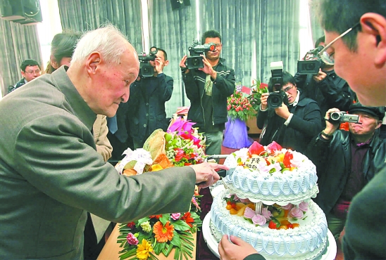 浙江大学玉泉校区优越的地理位置和自然环境,一直是莘莘学子向往该校的重要原因,浙大在几经搬迁后选址玉泉校区,有赖于当时浙大总务长严文兴。昨天,浙大师生特地在玉泉校区为这位老教授庆祝百岁生日。看着从国外特意赶回来、同样已经白发苍苍的学生,严老教授站起身,半开玩笑半认真地说:“凡事不要计较,就能和我一样长寿。”