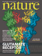 中枢神经系统中的大多数兴奋型神经传输(允许神经元彼此沟通的事件)是由离子型谷氨酸盐受体调控的,这些受体通过打开结合谷氨酸盐上的一个跨膜离子通道发挥作用。过去人们对它们的总体结构知之甚少,但现在Eric Gouaux及其同事报告了结合到一个竞争性拮抗剂上的对AMPA敏感的亚型“大鼠GluA2受体”的X射线晶体结构。该受体具有一个出乎意料的对称性和亚单元排列:总体上为双重对称,细胞外区域按局部二聚体对的形式来组织。离子通道区域表现出四重对称。这种结构(是根据来自定点诱变实验的数据获得的)表明,对NMDA敏感的受体GluN1和GluN2A在总体结构上与GluA2相似。从这些结构可以推断出非竞争性拮抗剂和孔阻断分子对离子通道的激发、脱敏和抑制机制。