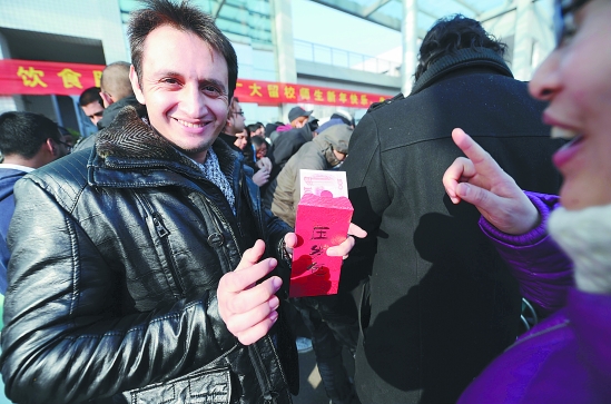 2月2日,浙江大学千名学子留校过年,其中有不少留学生。学校不仅准备了丰盛的年夜饭,还举行游园活动,给每位同学发压岁红包。 (本报记者 董旭明 摄)2011-02-03