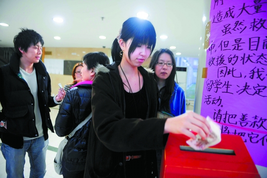3月14日,浙大玉泉校区的30多位日本留学生在校园里募捐,帮助日本受灾民众。