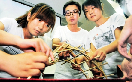 “哇!8个单元!”“啊~要倒了倒了~~”昨天,60位分别来自浙江大学和香港6所大学的学生,手里都拿着大把木筷子,经过一轮轮屏气凝神的搭建,他们的 “筷子廊桥”一一亮相——有的建构伟岸,有的却轰然倒塌。
