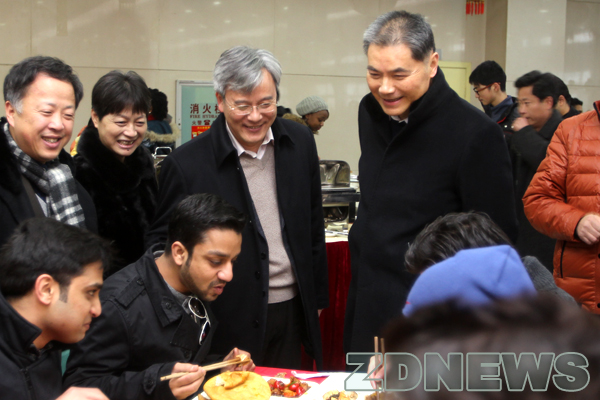 在紫金港校区,共有500余名师生留校过年,其中有近300名是留学生和他们的家属。金德水希望大家珍惜在浙江大学过中国年的机会,享受各种中西式美食,吃上一餐难忘的年夜饭。他说,浙江大学按照国家的要求,确定了分三步走战略实现创建世界一流大学的目标。2013年,是希望之年,也是大家的成功之年,更是我们的幸福之年。希望在全校师生员工的共同努力下,我们在培养时代高才,构建学科高峰,打造科研高地,汇聚名师高人,探索改革高招等工作中,有所创新,有所突破,有所成就。祝愿全校师生员工,在新的一年学业有成,身体健康,家庭幸福。