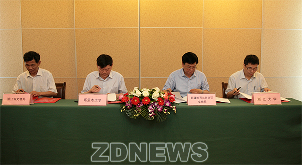 新疆文物局局长盛春寿、浙江省文物局副局长陈官忠、浙江大学副校长罗卫东、塔里木大学党委书记王选东出席年会,并代表四方签约。