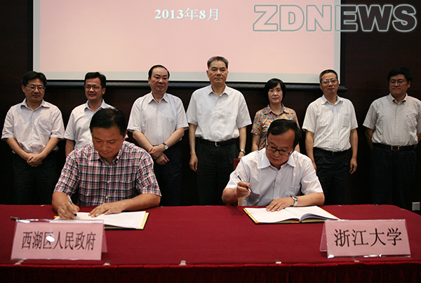 8月8日下午,浙江大学与西湖区在浙江大学紫金港校区西部院综合楼签订区校战略合作协议和协同创新合作协议。根据协议,双方将在科技创新、人才教育、社会民生事业等领域开展深度合作,助推浙江大学建设世界一流大学和西湖区打造美丽幸福首善之区。