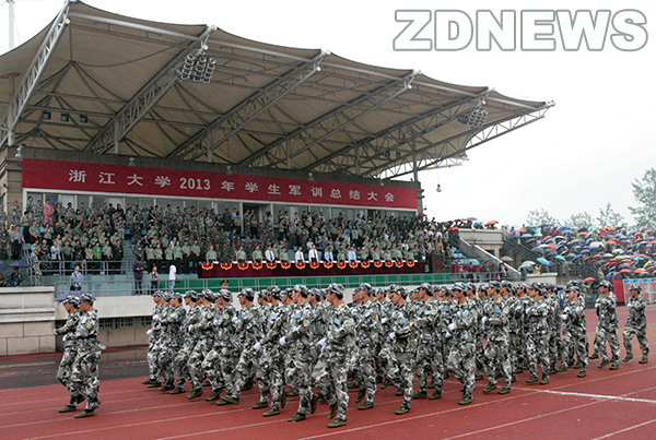 分列式,军体拳、旗语操和棍操……9月7日上午,浙江大学2013级学生军训总结大会在紫金港校区体育场举行,39个连队40余个方阵的5841位参训学生,展演了15天的军训成果。