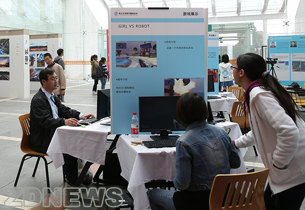 在动漫手绘前驻足观赏,在电脑前体验体感游戏的交互快感,在构图考究的装饰画前凝神品味……10月24日,紫金港校区月牙楼一楼展厅举行的第四届数字媒体专业开放日吸引了不少师生。展出的大部分都是数字媒体专业的本科学生作品,展区大体分为五个部分——手绘动漫,摄影作品,造型基础,游戏体验,交互体验。展出将持续到25日下午。