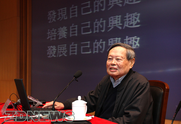 “发现自己的兴趣,培养自己的兴趣,发展自己的兴趣,成功就不远了。” 4月14日下午,93岁高龄的诺贝尔物理学奖获得者杨振宁先生做客浙江大学“理学大讲堂”,一头华发的他在2个多小时里,与浙大学子分享他的求学和研究的经验体会。浙大常务副校长吴朝晖代表学校授予杨振宁先生理学大讲堂纪念铭牌。