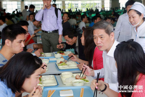 中国台湾网5月16日杭州消息 15日中午,浙江大学能够容纳1万人同时就餐的食堂挤满了刚刚下课前来打饭的学生。正在浙江调研的中共中央台办、国务院台办主任张志军赶到这里,与在浙大就读的台湾学生一起排队打饭,聊天餐叙。