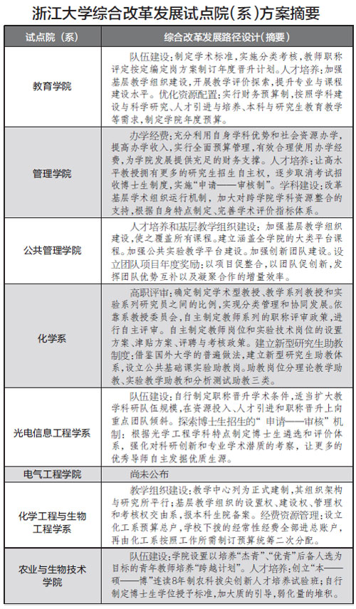 浙江大学目前选定8个院(系)进行综合改革发展试点。浙大校长林建华在接受记者采访时表示,大学是一个很复杂的机构,各学科特点不同,管理方式和评价方式也应不同,如果用一套管理办法、一套评价体系,很多学科只能削足适履。大学的管理和评价必须与学科多样性和复杂性相适应,要充分调动院系和教师的积极性,这是大学管理的要义,也是此番改革的主旨。