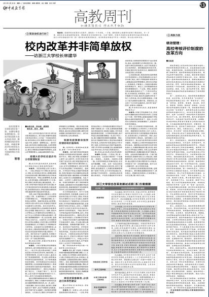 浙江大学目前选定8个院(系)进行综合改革发展试点。浙大校长林建华在接受记者采访时表示,大学是一个很复杂的机构,各学科特点不同,管理方式和评价方式也应不同,如果用一套管理办法、一套评价体系,很多学科只能削足适履。大学的管理和评价必须与学科多样性和复杂性相适应,要充分调动院系和教师的积极性,这是大学管理的要义,也是此番改革的主旨。
