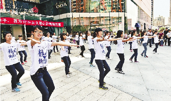 在西子湖畔钱王祠景区微笑亭,来自中国美术学院的大学生志愿者以青春热舞的方式,献上自己对核心价值观的理解,共同高喊:“我为社会主义核心价值观代言!”