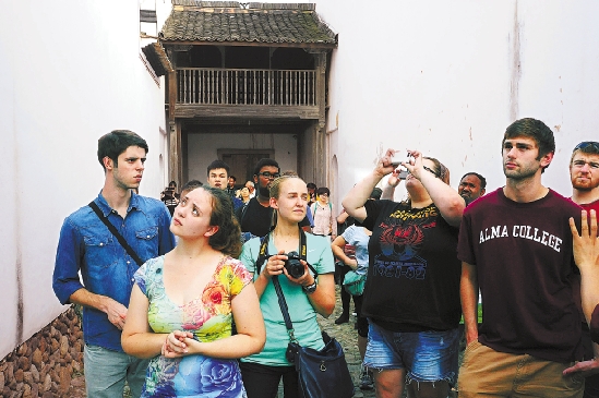 10月25日至26日,浙江大学13名留学生和教师代表作为“古村落保护国际志愿者”来到松阳县,寻找浙江最美古村落,感受古村落的文化魅力。 (本报记者 叶寒青 通讯员 阙献荣 摄)2014-10-27