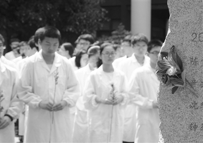 昨天下午1点,一百多位身穿白大褂的医学院师生肃立在纪念碑前,手捧菊花,深深鞠躬。