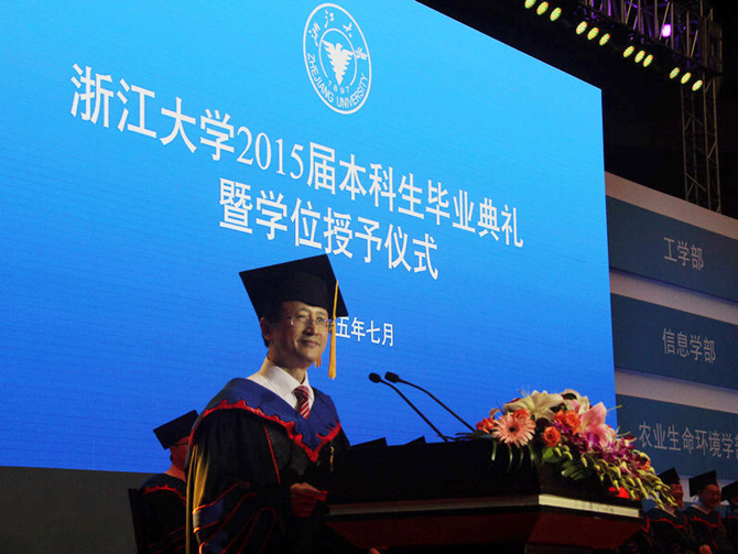 浙江大学校长吴朝晖在毕业典礼致辞,寄望毕业生们“秉持‘咬定青山不放松’的定力、‘众里寻他千百度’的勤奋、‘不破楼兰终不还’的执著,成为未来各行各业的创新者、领导者。”