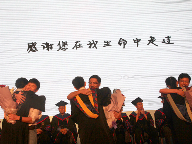 学生代表向教师代表献花,感恩老师们四年来的悉心教导和倾心付出,千言万语都在这深情的拥抱里。