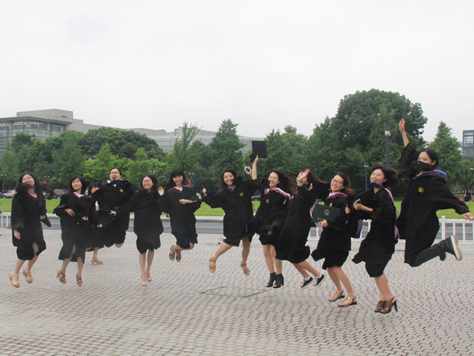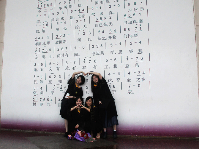 校歌墙前,毕业照的必选经典。姐妹们,我们的心永远在一起!