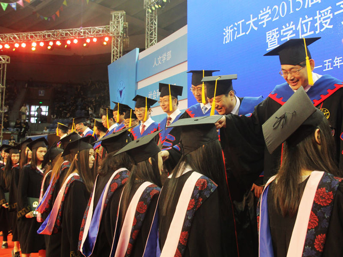 浙江大学校领导为毕业生正冠拨穗,正式授予学位。
