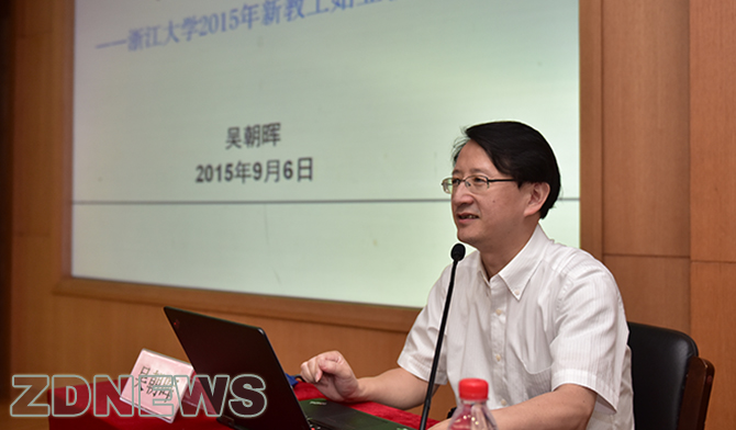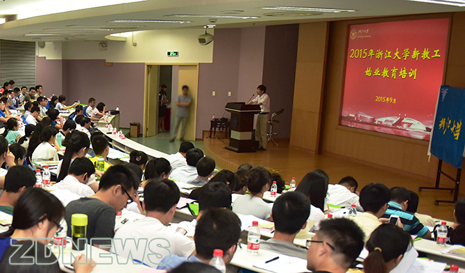 从9月6日开始,浙江大学对2014年9月后新入职的近200名教工进行为期一个多月的始业教育培训。6日上午,在培训班的首场报告会上,校长吴朝晖为新教工阐释了教师职业的特点和价值,勉励大家在浙江大学这个大舞台上迅速成长,专心工作,成为快乐、自由、幸福的浙大人。