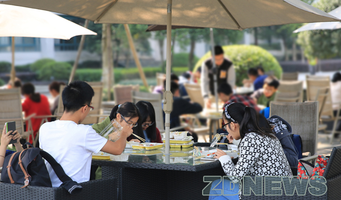 10月13日午间,大二学生小朱和平时一样,为了节省时间,下课后没有去大食堂用餐,而是顺便从东二教学楼流动快餐点买了一份盒饭“解决”午餐。这样的午餐方式,在浙大被形象地称为“学霸餐”。小朱是控制科学与工程专业的学生,由于经常在东三、东四教学楼的实验室做“大物”实验,实验往往会拖迟时间,下午西教的课排得又紧、路也远,选择学霸餐成为她的家常事。不过,不同的是,她今天就餐时又一次享受到了东二、东三之间学校新摆设的凉棚和餐桌椅提供的便利,不像以往只能“因地制宜”找个可以搭靠的地方随便对付一下。