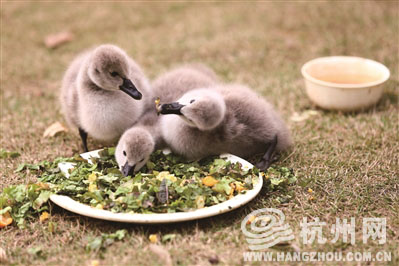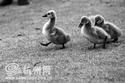昨天,我们来到浙大紫金港,饲养员汪师傅正把小天鹅放在草坪上晒太阳。3只小天鹅,灰色的绒毛,黑色脚蹼,远远看去,像毛线球。汪师傅拍着手,喊着口令,小天鹅摇摇晃晃列队走了起来。路过的同学,蹲下来给小天鹅拍照。小天鹅不怕生,有时候还会停下来啄一下女同学的手指。