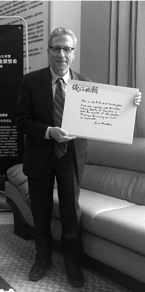 马斯金昨天一天的行程很紧张。早上去参观了西湖,下午就马不停蹄地赶到讲座现场,既要介绍自己的理论,又要和中国听众互动。讲座结束后,他显得有些疲惫,但面对记者的提问,还是微笑着礼貌而耐心地解答。