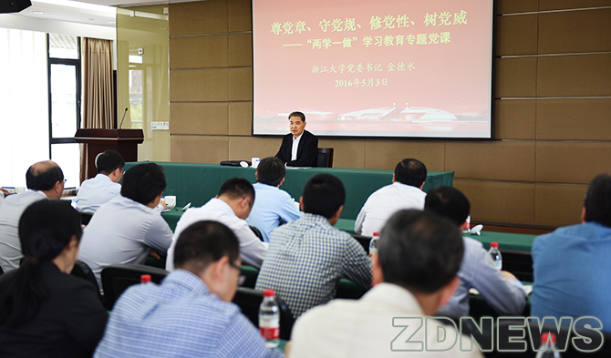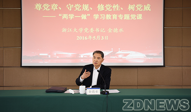 5月3日下午,浙大举行“两学一做”学习教育专题党课。校党委书记金德水针对全体中层干部提出要“尊党章、守党规、修党性、树党威”,进一步正本清源、坚定理想、划清底线、摆正位置。校党委常务副书记邹晓东主持会议。