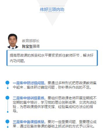 陈宝生强调,提高思政课的质量和水平要紧紧抓住教师环节,解决好内功问题。一是集中研讨提问题。要通过多种形式把思政课教师集中起来,集体研讨确定问题,弥补单兵作战的不足。二是集中培训提素质。要组织思政课老师开展定期或不定期的集中培训,学习党的理论创新成果、交流先进经验,为思政课提供学理支撑、经验集成和方法论的指导。三是集中备课提质量。要对一些重要问题、重要理论成果,通过在集体备课的基础上抓试讲的方式予以深化。