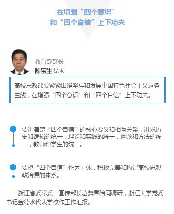12月4日,教育部党组书记、部长陈宝生到浙江大学调研并听取学校工作汇报。陈宝生在调研中强调,高校思想政治工作的成效在很大程度上取决于思政课水平高不高、效果好不好、阵地牢不牢。全国高校要打一场提高思政课质量和水平的攻坚战,以实际行动推动高校思想政治工作迈上新台阶。