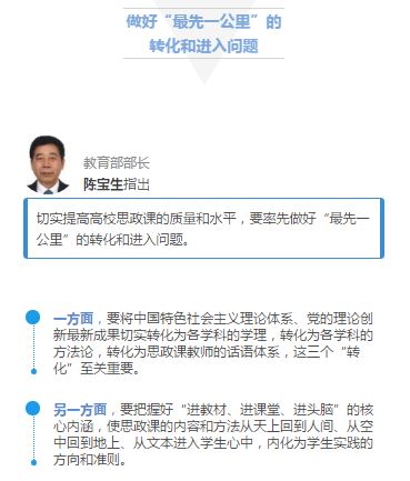 陈宝生指出,切实提高高校思政课的质量和水平,要率先做好“最先一公里”的转化和进入问题。一方面,要将中国特色社会主义理论体系、党的理论创新最新成果切实转化为各学科的学理,转化为各学科的方法论,转化为思政课教师的话语体系,这三个“转化”至关重要。另一方面,要把握好“进教材、进课堂、进头脑”的核心内涵,使思政课的内容和方法从天上回到人间、从空中回到地上、从文本进入学生心中,内化为学生实践的方向和准则。