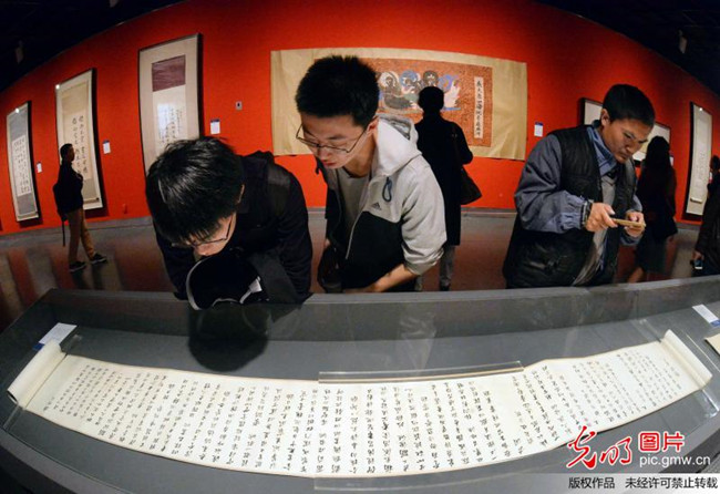 2017年11月2日,参观者在浙江大学百廿书画作品展上欣赏马一浮的行书作品《鹧鸪天》词九首。