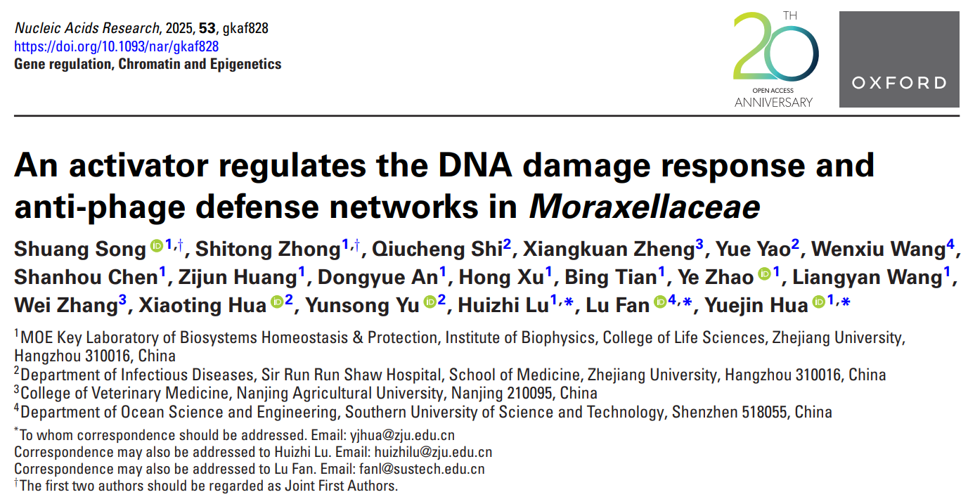2025年8月28日,浙江大学华跃进/陆慧智团队联合南方科技大学范陆团队在Nucleic Acids Research上在线发表题目为An activator regulates the DNA damage response and anti-phage defense networks in Moraxellaceae的研究文章。