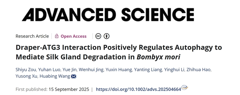 细胞自噬是调控细胞稳态和器官降解的关键机制,在昆虫变态与发育研究中备受关注,然而其核心分子调控机制尚不明确。近日,浙江大学动物科学学院王华兵教授课题组在国际知名期刊《Advanced Science》上发表了题为“Draper-ATG3 Interaction Positively Regulates Autophagy to Mediate Silk Gland Degradation in Bombyx mori”的研究论文。