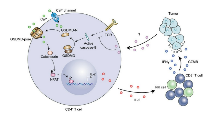 CD4+ T细胞中GSDMD 调控抗肿瘤免疫的作用模式图。