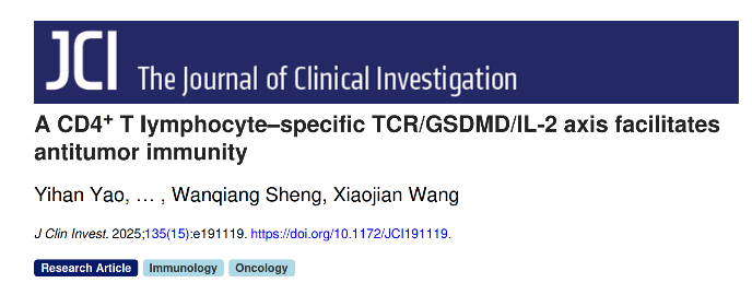 2025年8月,浙江大学基础医学院王晓健/生万强团队在J clin Invest杂志上发表题为A CD4 + T lymphocyte–specific TCR/GSDMD/IL-2 axis facilitates antitumor immunity的研究论文。该工作首次揭示了CD4+ T细胞中GSDMD的活化以不依赖于细胞焦亡的形式,而是通过促进IL-2转录发挥增强抗肿瘤免疫的作用,抑制肿瘤生长。