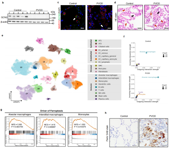 通过多组学分析,团队发现PVOD患者及模型动物的肺静脉内皮细胞(VECs)中动脉特化相关基因NRP1、KDR和EFNB2表达增强,提示静脉内皮动脉化现象。为明确VEC动脉化的成因,研究者用单细胞测序发现的巨噬细胞中表达升高的GDF15、CCL3、TNF等细胞因子,及铁分别处理GCN2敲除的HUVEC,结果发现铁刺激可显著诱导动脉化基因表达上升。