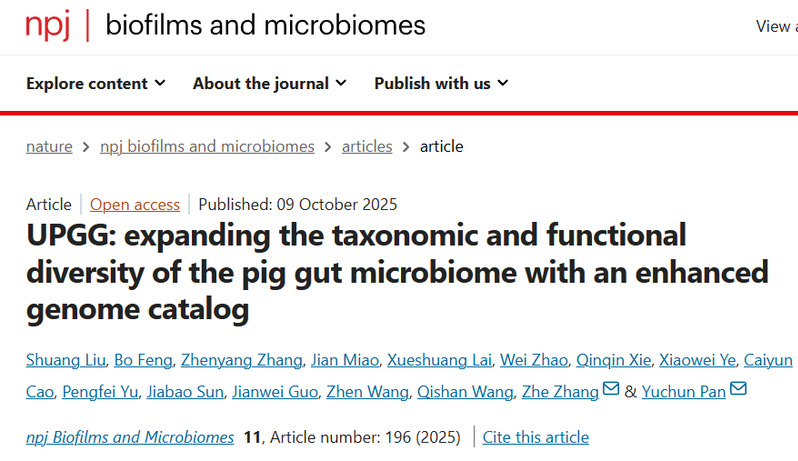 近日,浙江大学动物科学学院潘玉春教授/张哲副研究员团队在《NPJ Biofilms and Microbiomes》(IF5=9.9)上发表了题为《UPGG: expanding the taxonomic and functional diversity of the pig gut microbiome with an enhanced genome catalog》的研究论文。