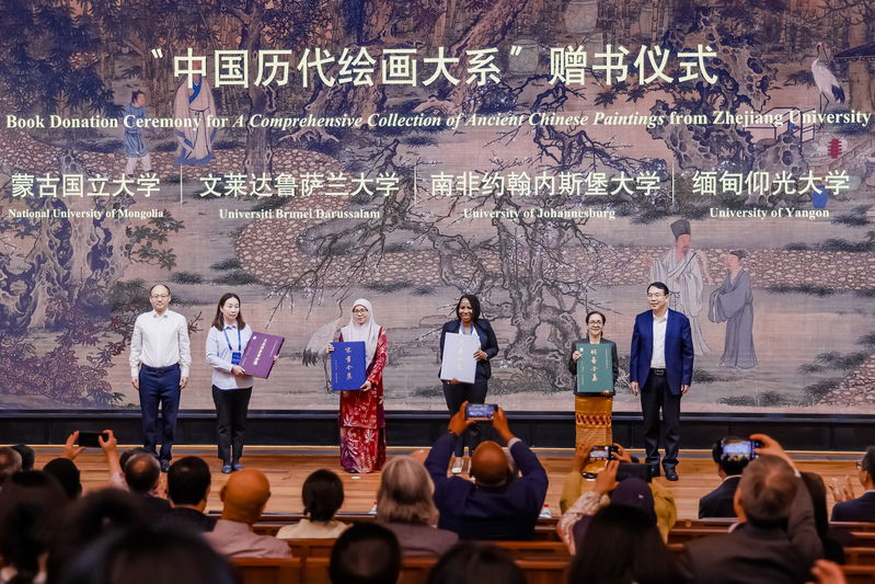 开幕式上,浙江省委常委、宣传部部长赵承,浙江大学校长马琰铭致辞并为蒙古国立大学、文莱达鲁萨兰大学、缅甸仰光大学、南非约翰内斯堡大学赠书。“中国历代绘画大系”总主编张曦出席,浙江大学党委副书记朱慧主持。