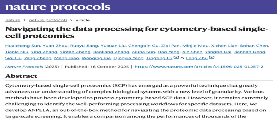 10月16日,浙江大学药学院朱峰教授和付婷婷博士团队在Nature Protocols发表题为“navigating the data processing for cytometry-based single-cell proteomics”的研究论文,提出面向单细胞蛋白组学的数据处理工作流优选方法ANPELA(https://idrblab.org/anpela/)。该方法以机器学习与多维度评估为支撑,聚焦细胞亚群鉴定与伪时间轨迹推断两项关键任务,在提升处理稳健性与准确性的同时,为药理机制解析与精准医学研究提供可复用、可推广的单细胞蛋白组学数据处理技术路径。