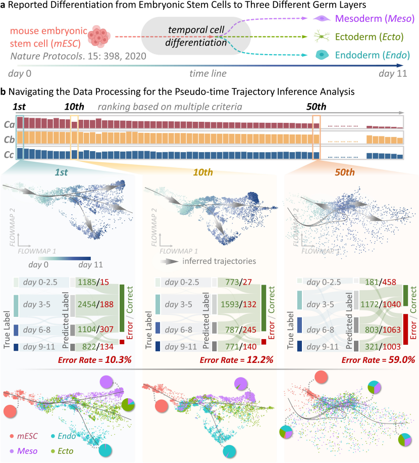 在小鼠胚胎干细胞分化的单细胞蛋白组学数据上,研究团队进一步验证了所提出方法对伪时间轨迹推断的显著增益。该数据覆盖连续11天的多时间点采样,理想的轨迹应自胚胎干细胞出发,沿三条支路分别分化为外胚层、中胚层与内胚层,并在时间序列上与真实生物进程相一致。然而,若直接采用领域内常用的处理流程,分析结果会出现严重偏差,不仅轨迹的起点与终点错误,伪时间与真实时间的误差也超过50%。在部分伪时间与真实时间的误差较低的数据处理结果中,其对应的细胞分化轨迹亦频繁缺失中胚层分支。