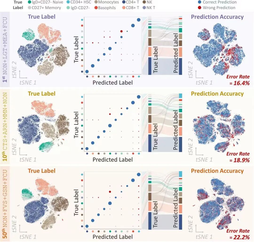 研究人员开展了新冠病毒感染者与健康人群外周血细胞亚群鉴定研究,验证了此项工作所提出方法的效果。针对36例感染者与45名健康人的单细胞蛋白质组学数据,开展了大规模的工作流优选。结果显示,若不加选择地使用领域内常用的处理流程,细胞类型注释的误差可能超出预期(错误率超过20%)。相比之下,研究人员开发的ANPELA可将错误率大幅降低(下降幅度可达6% ~ 20%)。在对CD4⁺ T细胞、CD8⁺ T细胞与嗜碱性粒细胞等关键细胞亚群的鉴定中,ANPELA实现近乎完美的识别(错误率低于1%)。