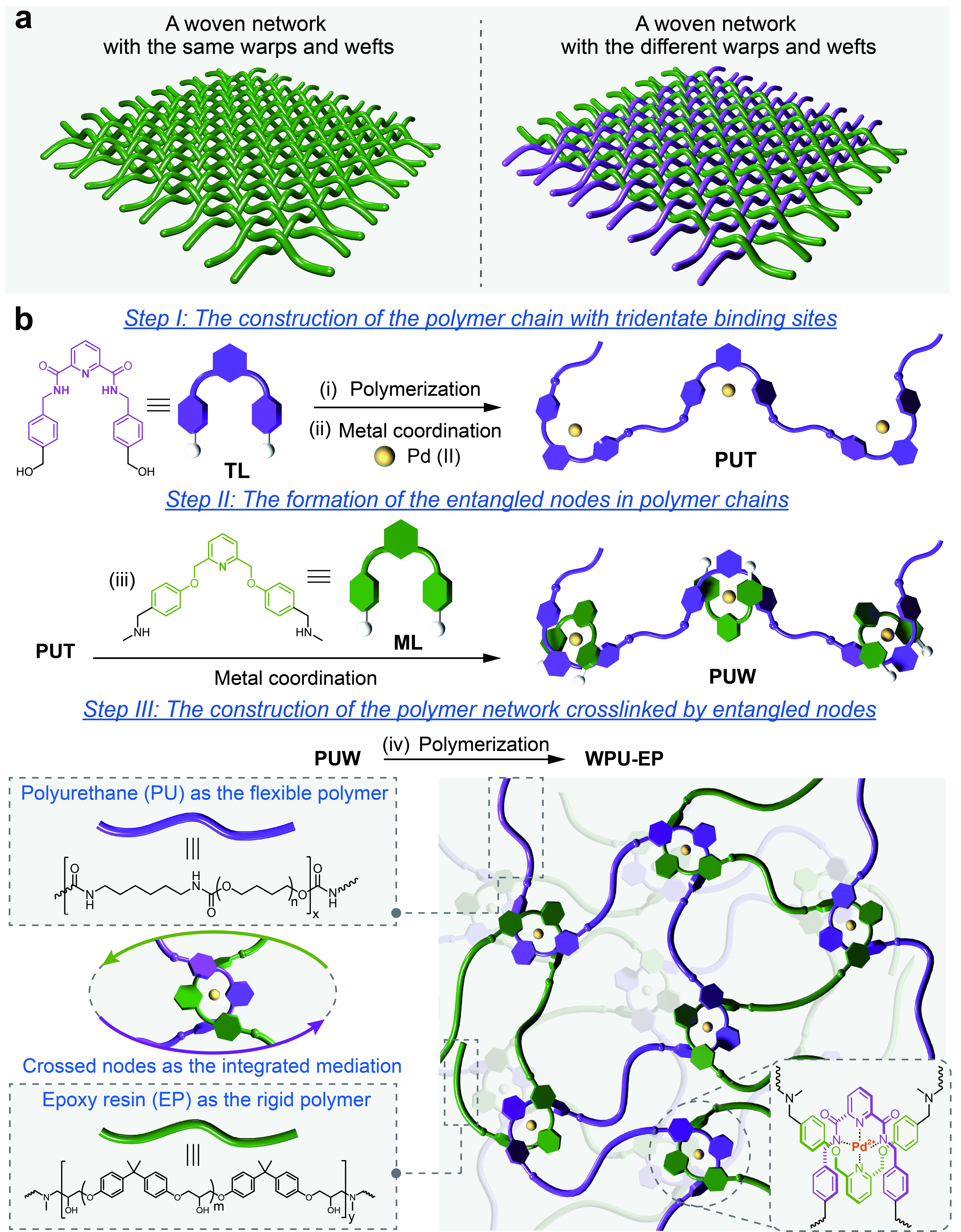 古老的编织技术通过大量缠结节点将简单的线性材料交织在一起,不仅能构建复杂的拓扑结构并赋予其卓越的机械性能,还能够将不同类型的材料高效整合,实现多材料间的高度协同。在此启发下,作者利用不对称交叉配位构筑编织节点,通过分步聚合诱导聚氨酯和环氧树脂链缠结形成网络结构。得益于网络中编织节点的动态协同作用,两类聚合物链段得以高效整合,从而获得了机械性能优异的聚合物材料WPU-EP。