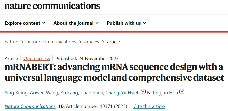 11月24日,浙江大学药学院侯廷军和谢昌谕团队在Nature Communications发表题为“mRNABERT: advancing mRNA sequence design with a universal language model and comprehensive dataset”的论文。该研究提出了首个基于大规模高质量数据(1800万条序列)预训练的通用mRNA设计模型mRNABERT。该模型创新性地采用了双重词元化策略,将非翻译区的核苷酸和编码区的密码子分别编码,并引入跨模态对比学习框架以融合蛋白质序列的语义信息。mRNABERT基于Transformer架构,利用线性偏差注意力(ALiBi)和Flash Attention技术,有效解决了全长及超长mRNA序列的建模难题。在全面的基准测试中,该模型展现了卓越的性能:在5' UTR核糖体负载预测任务中,其Spearman相关系数最高达到0.962,优于已报到的最优模型;在CDS稳定性和表达预测任务中,全面超越了CodonBERT等基线模型;特别是在全长mRNA性质预测任务中,mRNABERT表现稳健,其R²值比次优模型高出1.6至10.4倍,充分展示了其在mRNA疫苗和药物研发中的巨大应用潜力 。
