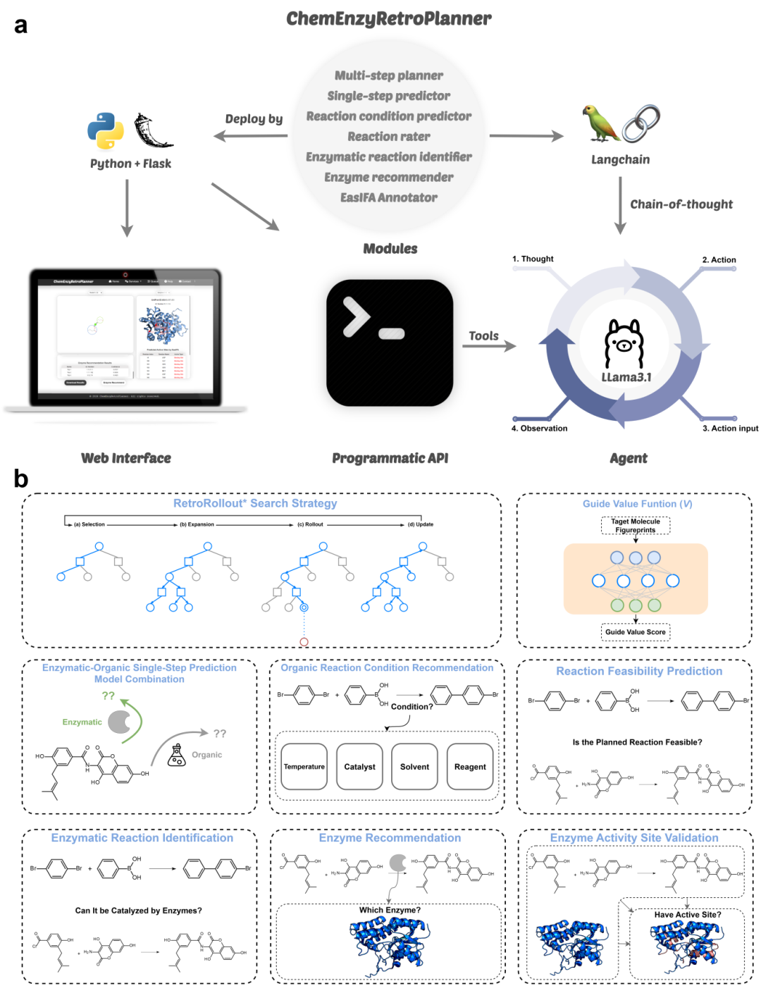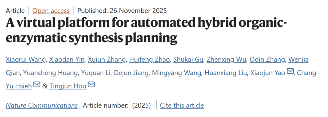 近日,浙江大学药学院侯廷军和谢昌谕团队、澳门理工大学姚小军团队在Nature Communications上发表了题为“A Virtual Platform for Automated Hybrid Organic-Enzymatic Synthesis Planning”的研究成果。作者提出了一个全新的AI驱动混合式合成规划平台ChemEnzyRetroPlanner,涵盖混合逆合成设计、反应条件预测、酶反应识别及活性位点验证等功能,并基于Llama3.1模型构建了链式推理智能体,能够自主协调调用丰富的化学与酶催化工具,实现了从路径规划到可行性评估的自动化。实验结果表明,ChemEnzyRetroPlanner在多个基准数据集及天然产物合成任务上均优于主流逆合成工具,展示了其在药物合成路线设计中的实用性与准确性。