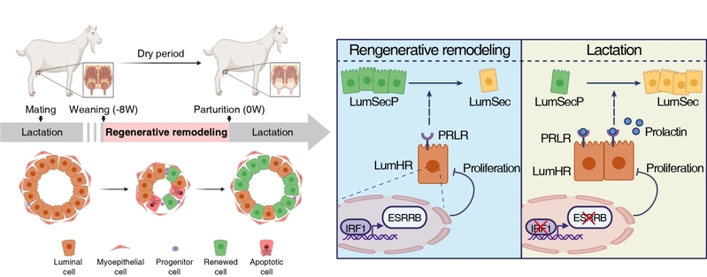 乳腺再生性重构在人类、啮齿类和反刍动物等多种物种中均存在。相比其他动物,奶山羊(Capra hircus)体型适中、可操作性高、组织结构与人类更接近等,是研究乳腺重构的理想大型动物模型。研究团队在萨能奶山羊上,利用单细胞测序、表观遗传与组织学分析等方法,系统描绘了再生性重构期间乳腺细胞谱系及基因调控网络的变化特征。研究发现,在再生性重构过程中,LumSecP显著积累,而表达激素受体的 LumHR 细胞比例显著下降,对于 LumSecP 的积累至关重要。通过乳腺类器官以及在小鼠靶向消融 LumHR试验,证实 LumHR 是调控 LumSecP 积累与分化的核心调节开关。进一步地,通过整合单细胞转录组与ATAC-seq等多组学数据,研究团队鉴定出转录因子 IRF1 是限制 LumHR 扩增的关键负调控因子。乳腺再生性重构期,IRF1表达升高,通过上调 ESRRB 阻止 LumHR 的过度扩增;而在 IRF1 活性降低或缺失的情况下,LumHR 异常扩增,驱动 LumSecP 向 LumSec 分化,加速再生性重构过程。综上,该研究揭示了乳腺再生性重构中“细胞谱系关键因子”之间的协同调节机制,强调靶向谱系与特异性分子可为调控乳腺发育与组织更新提供有效策略。