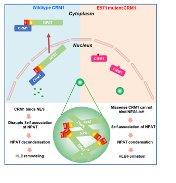 在此基础上,课题组进一步提出科学问题:在NPAT转运出核的时候,调控其相分离的关键分子及机理是什么?并于2026年1月2日于《Journal of Cell Biology》杂志再次发文,揭示了出核转运受体蛋白CRM1对核蛋白转运及凝聚的“一石二鸟”调控功能。研究人员通过免疫共沉淀及组学筛选,发现出核转运受体CRM1(exportin1)能够特异性地结合NAPT,并驱动NPAT的转运出核。课题组进一步确认了NPAT的凝聚受到CRM1的抑制,并鉴定了NPAT序列中受CRM1调控凝聚的关键序列。一系列生化实验揭示:在介导NPAT发生凝聚的关键序列中,隐藏着一段与CRM1结合的出核信号序列。因此,CRM1在介导NPAT出核的同时,还竞争性地破坏了其自我互作,并抑制其发生凝聚。我们将这一调控策略命名为“竞争性占据模型”。值得一提的是,CRM1的疾病相关突变则丧失了对NPAT凝聚的调控作用。本研究通过解析核蛋白NPAT在出核转运中调控凝聚的机制,阐明了核内无膜细胞器组蛋白基体的动态调控机理。