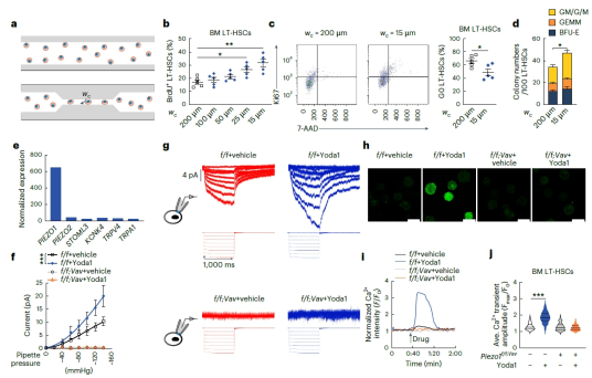 该课题组采用微流控和电生理技术发现剪切力诱导HSC增殖和髓系分化, Piezo1介导HSC的离子电流和 Ca2+内流(图1)。造血细胞特异性敲除Piezo1减少HSC的增殖和髓系分化。进一步通过单细胞转录组测序(scRNA-seq)发现激活Piezo1上调Jam3信号影响HSC的增殖,并揭示Piezo1通过Tcf7l2诱导Jam3的表达。此外,Piezo1介导Ca2+内流特异性激活Capn2,从而驱动HSC向髓系分化。