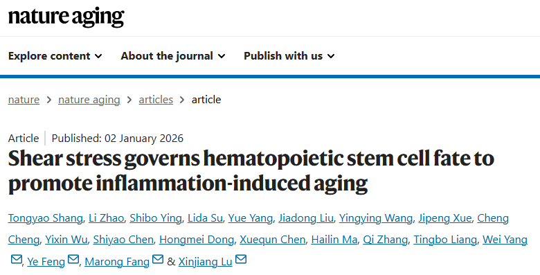 2026年1月2日,浙江大学基础医学院陆新江团队在Nature Aging杂志上在线发表题为“Shear stress governs hematopoietic stem cell fate to promote inflammation-induced aging”的研究论文。研究阐述了机械敏感离子通道Piezo1 感知血流剪切力,介导HSC 增殖和髓系分化的分子机制。